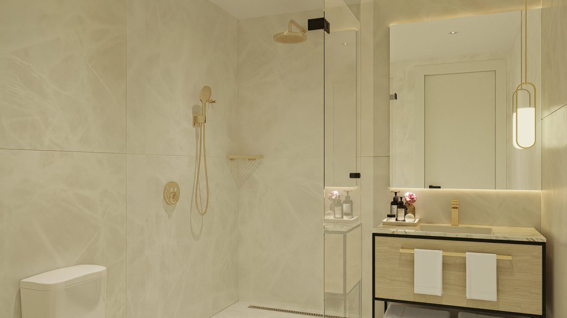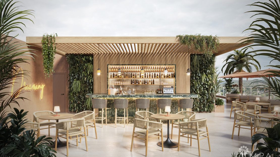 Residents enjoy exclusive access to a rooftop terrace with resort-style pool and hot tub, sauna and steam rooms, meditation garden, daybeds, children’s areas, and a bar with limited food service. Partial views of the Caribbean Sea and North Sound are available from the rooftop.