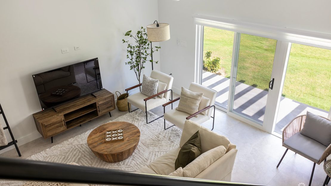 Living Space: The private patio overlooks the pool which is accessible via French doors from the living area, which is in prime position in Phase Two.
