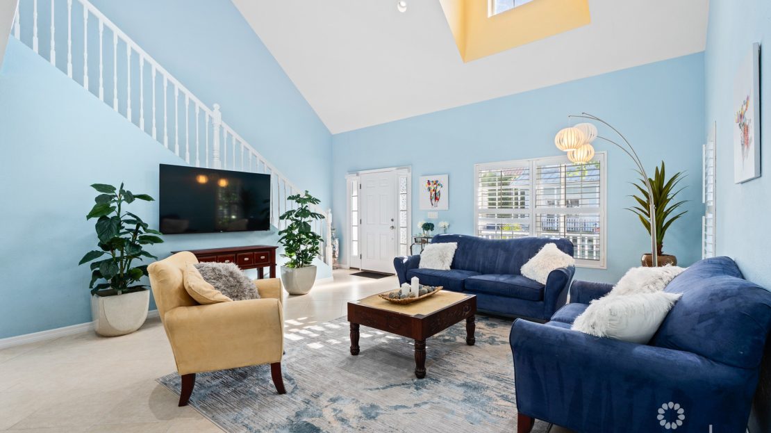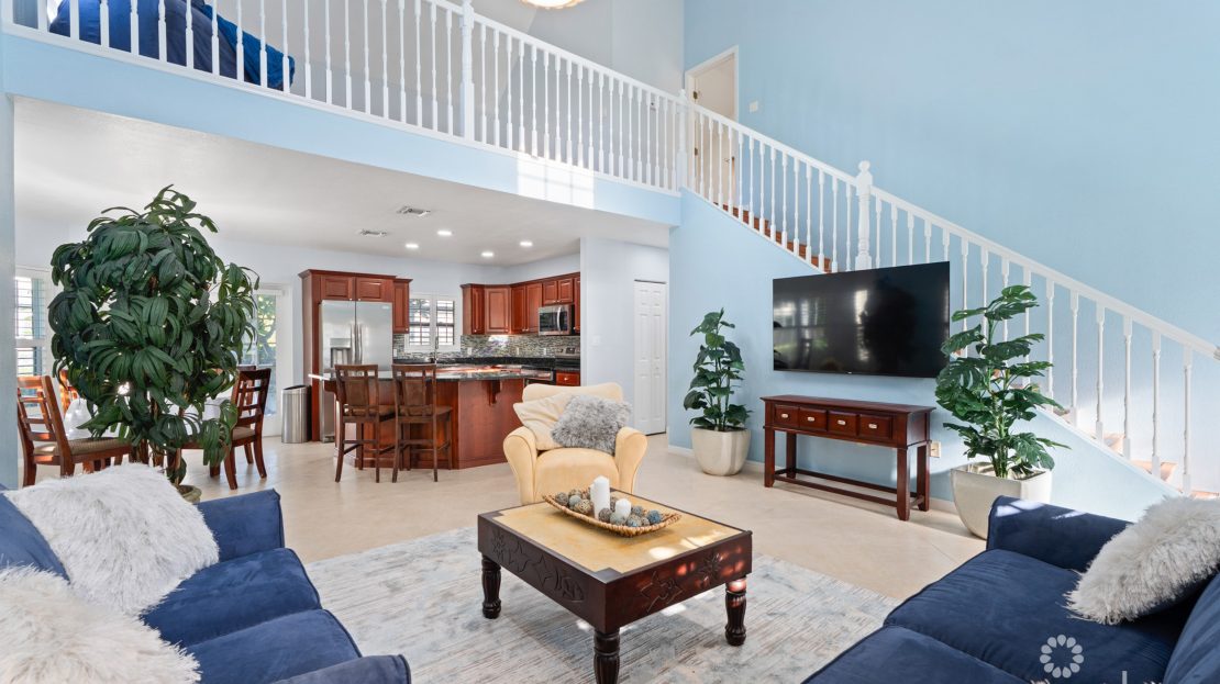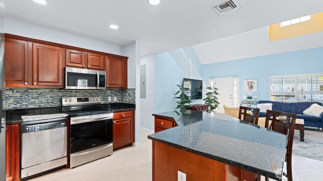 Step inside to discover impressive high ceilings throughout the open-plan living area, creating a bright and welcoming environment. The kitchen features a breakfast bar, granite countertops, ample storage, and new appliances.