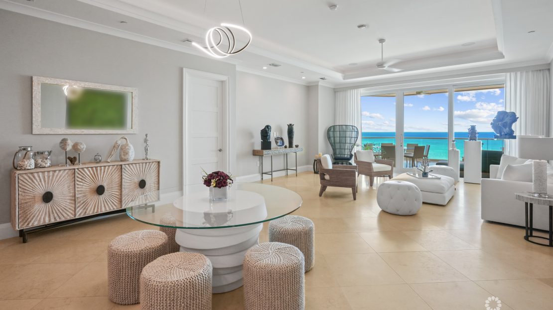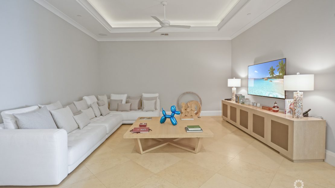 Apartment 503 at The WaterColours is decorated throughout in a calm, neutral palette that doesn’t try to compete with the symphony of vibrant watercolors on display in the Caribbean Sea beyond, which naturally become the focal point for the living room, dining area and principal bedroom. The extensive balcony comfortably offers ample space for sunset dining, sunbeds and a sectional sofa and is, understandably, one of the most popular rooms in the property. The luxury, curated furniture package included in the sale features exclusive Italian brands such as B&B, Flexform, Flou along with pieces sourced locally through IDG. All three bedroom suites include high-end, custom dressing room cabinetry fabricated in Italy specifically for the residence. The same craftsmanship is seen in the media lounge in a custom cabinet designed to house a Dolby Digital Home Theatre Surround Sound System. Throughout the apartment, the feeling is one of serene sophistication and modern luxury with a relaxed ambiance.
