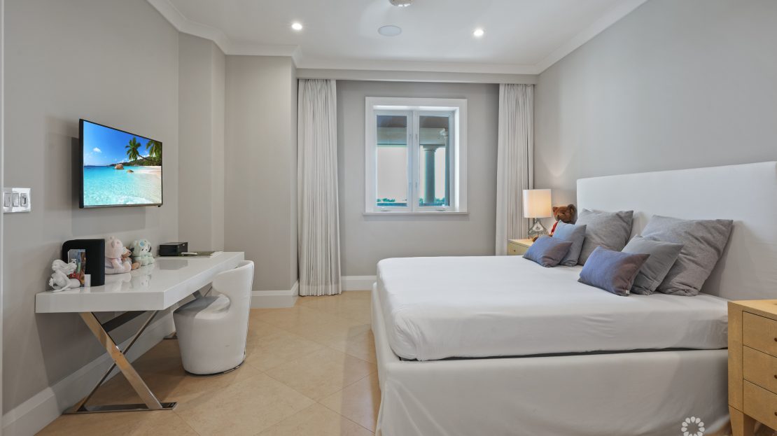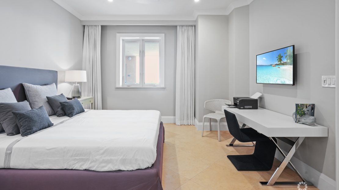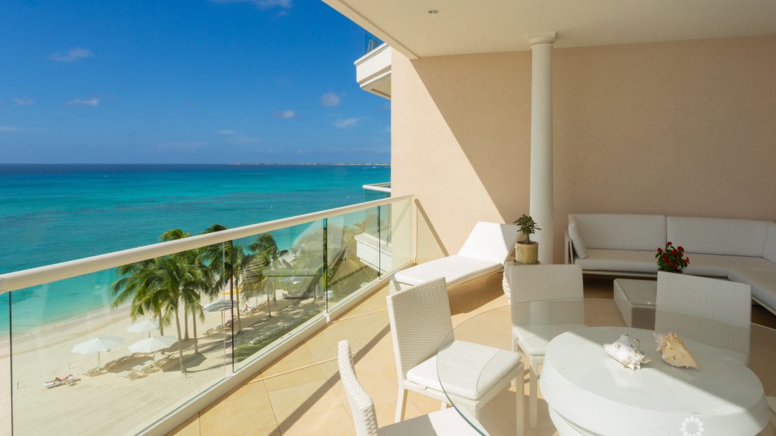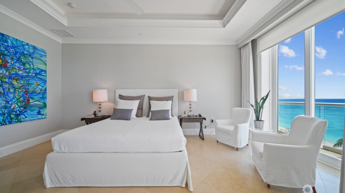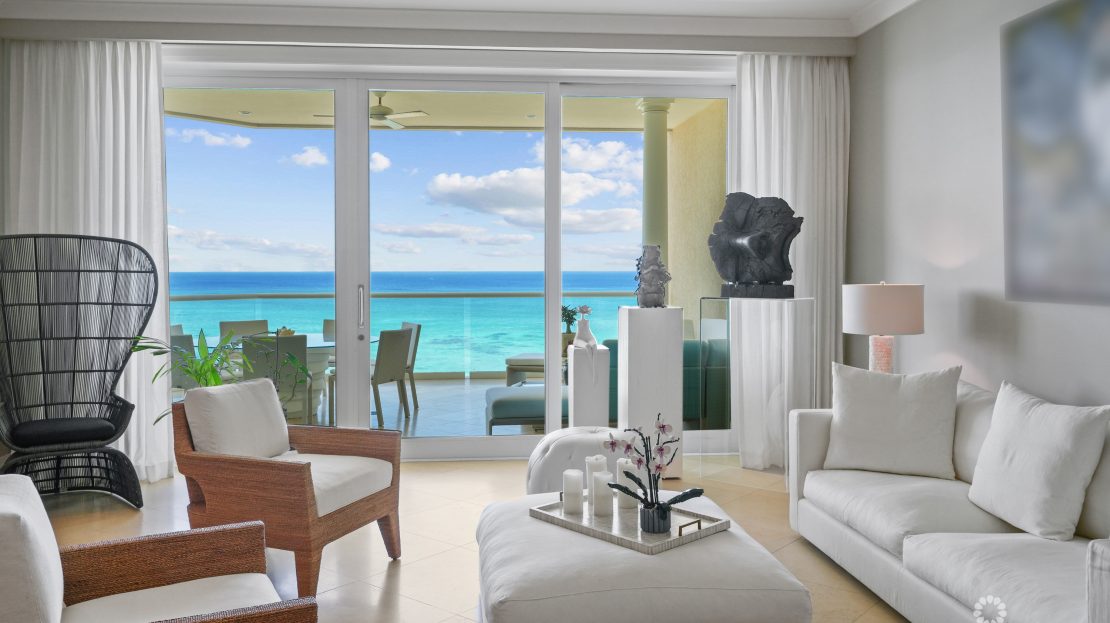 Apartment 503 at The WaterColours is decorated throughout in a calm, neutral palette that doesn’t try to compete with the symphony of vibrant watercolors on display in the Caribbean Sea beyond, which naturally become the focal point for the living room, dining area and principal bedroom. The extensive balcony offers ample space for sunset dining, sunbeds and a sectional sofa and is, understandably, one of the most popular rooms in the property. The luxury, curated furniture package included in the sale features exclusive Italian brands such as B&B, Flexform, Flou along with pieces sourced locally through IDG. All three bedroom suites include high-end, custom dressing room cabinetry fabricated in Italy specifically for the residence. The same craftsmanship is seen in the media lounge in a custom cabinet designed to house a Dolby Digital Home Theatre Surround Sound System. Throughout the apartment, the feeling is one of serene sophistication and modern luxury with a relaxed ambiance.