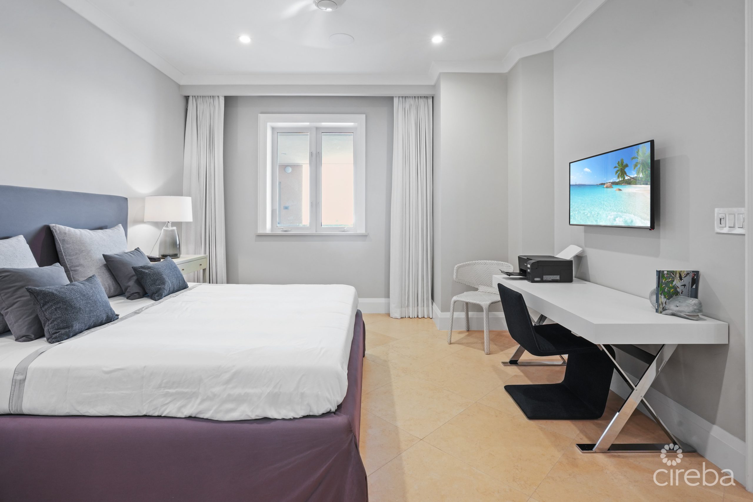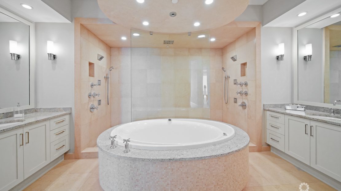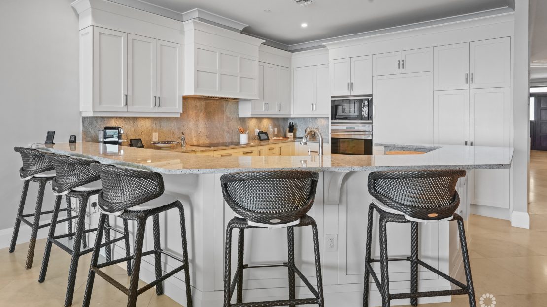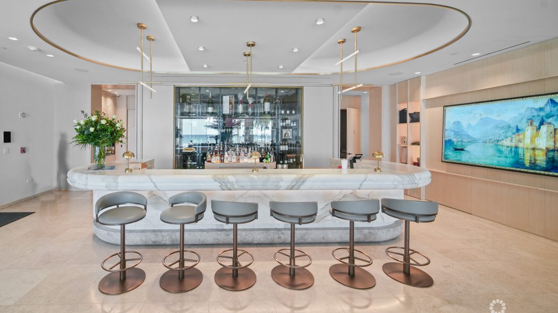 Apartment 503 at The WaterColours is decorated throughout in a calm, neutral palette that doesn’t try to compete with the symphony of vibrant watercolors on display in the Caribbean Sea beyond, which naturally become the focal point for the living room, dining area and principal bedroom. The extensive balcony offers ample space for sunset dining, sunbeds and a sectional sofa and is, understandably, one of the most popular rooms in the property. The luxury, curated furniture package included in the sale features exclusive Italian brands such as B&B, Flexform, Flou along with pieces sourced locally through IDG. All three bedroom suites include high-end, custom dressing room cabinetry fabricated in Italy specifically for the residence. The same craftsmanship is seen in the media lounge in a custom cabinet designed to house a Dolby Digital Home Theatre Surround Sound System. Throughout the apartment, the feeling is one of serene sophistication and modern luxury with a relaxed ambiance.