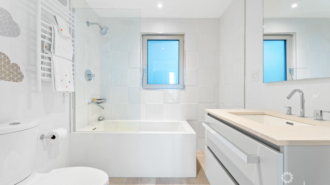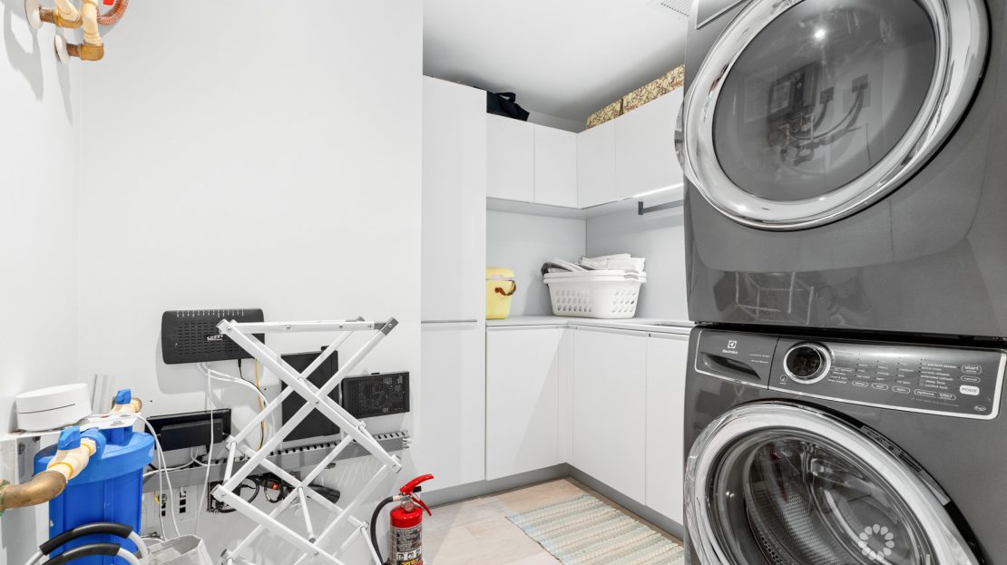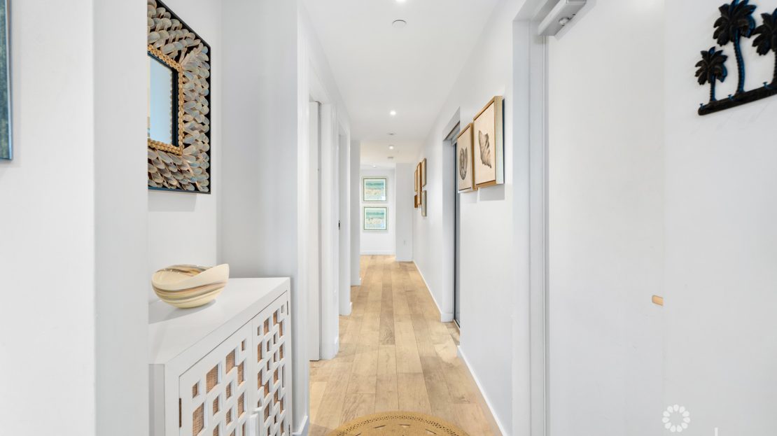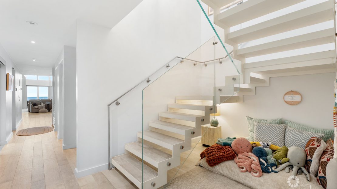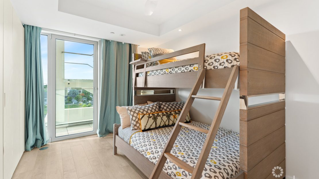 Enter from your shaded, private parking (offering 2 parking spots), via secure key fob access into your private elevator, arriving directly to your front door. Inside, a welcoming hallway leads past a full guest bathroom and large laundry room, before revealing a cleverly designed third bedroom suite—featuring a split double bedroom with bunk, ensuite bath, and adjoining media room that could also serve as an office or fourth bedroom. At the base of the stairs, a charming children’s reading nook adds a playful touch.