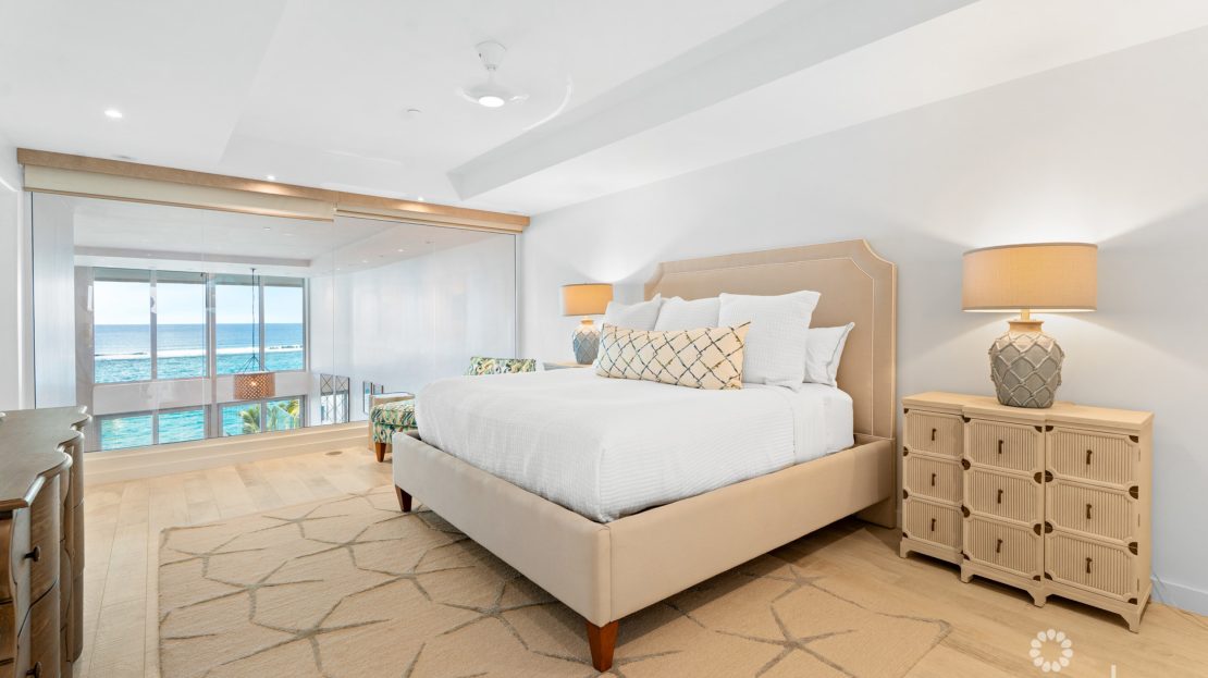 Ascend the elegant glass staircase, illuminated by a statement chandelier, to discover the primary suite of your dreams—a serene retreat with panoramic ocean views, a spa-like ensuite with sea-view soaking tub, and a bespoke walk-in closet. A second guest suite, also king-sized, offers island views, an ensuite bath, and a generous walk-in closet with a built-in workspace.