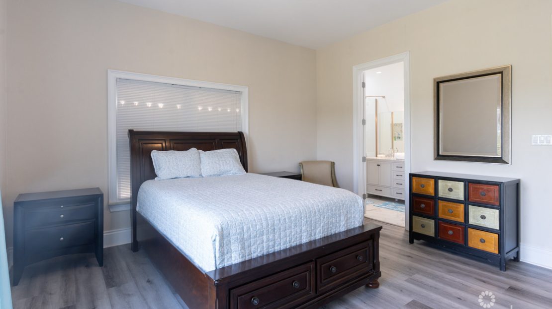 An open plan kitchen, dining area, living room area and a half bath are on the second (main) floor.