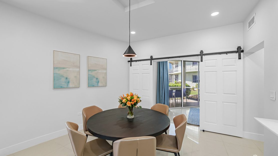 The kitchen is equipped with state-of-the-art appliances and ample counter space, catering to both casual meals and gourmet cooking. The adjoining dining area provides a seamless flow for hosting dinner parties or enjoying family meals with a backdrop of stunning pool and ocean views.