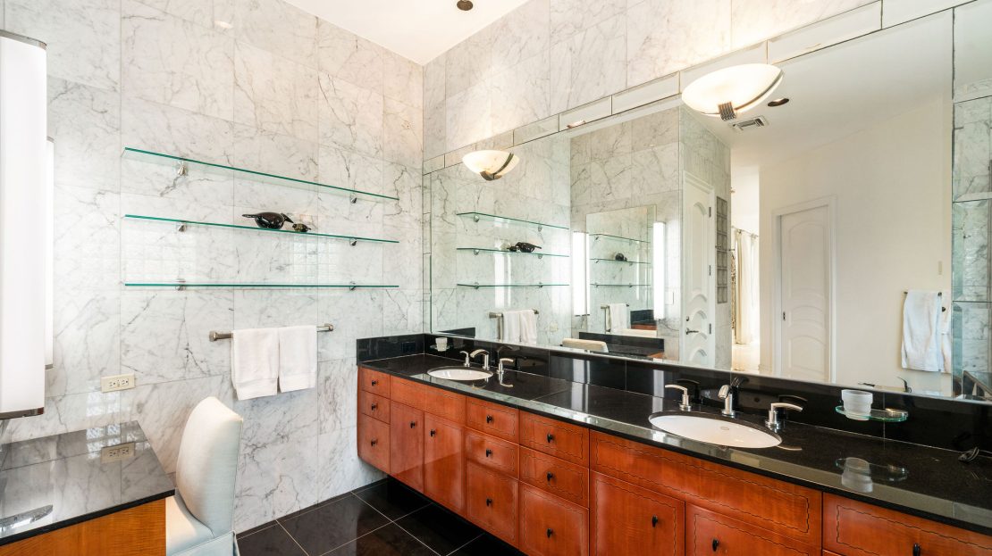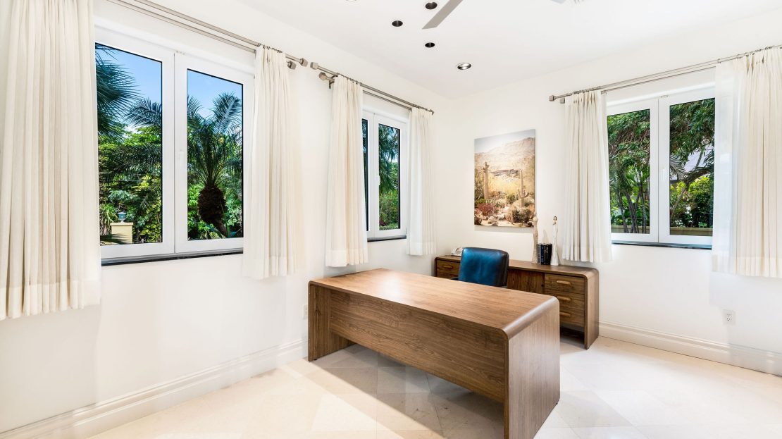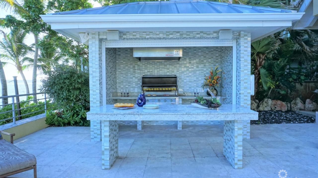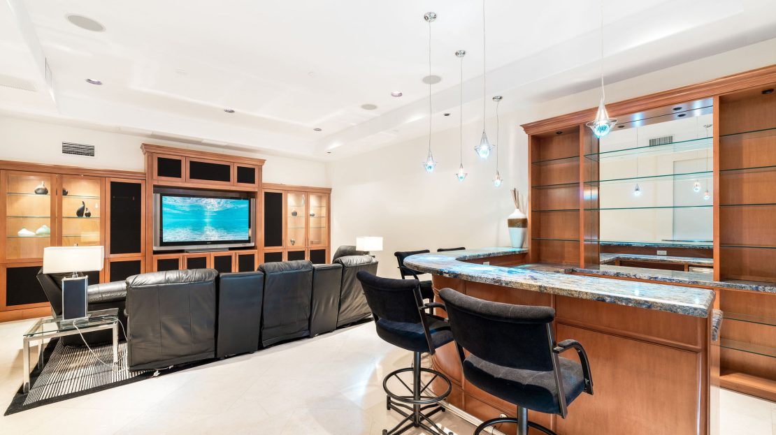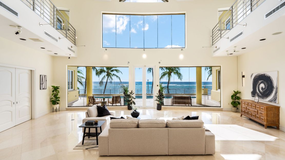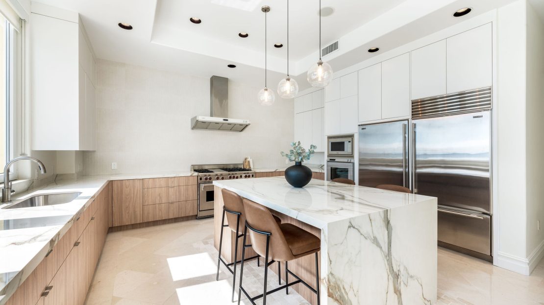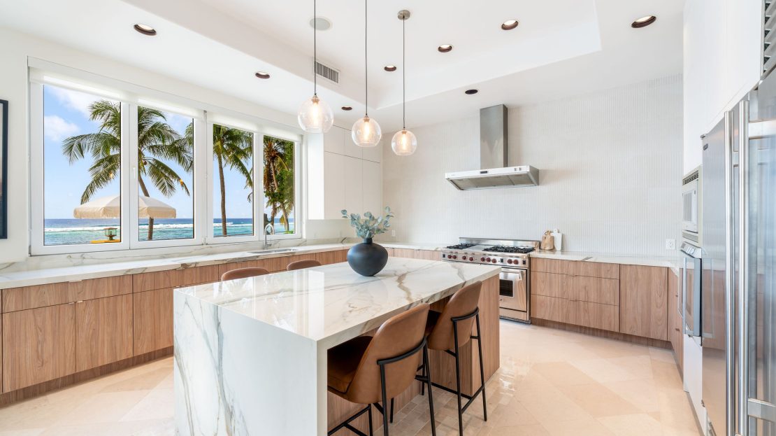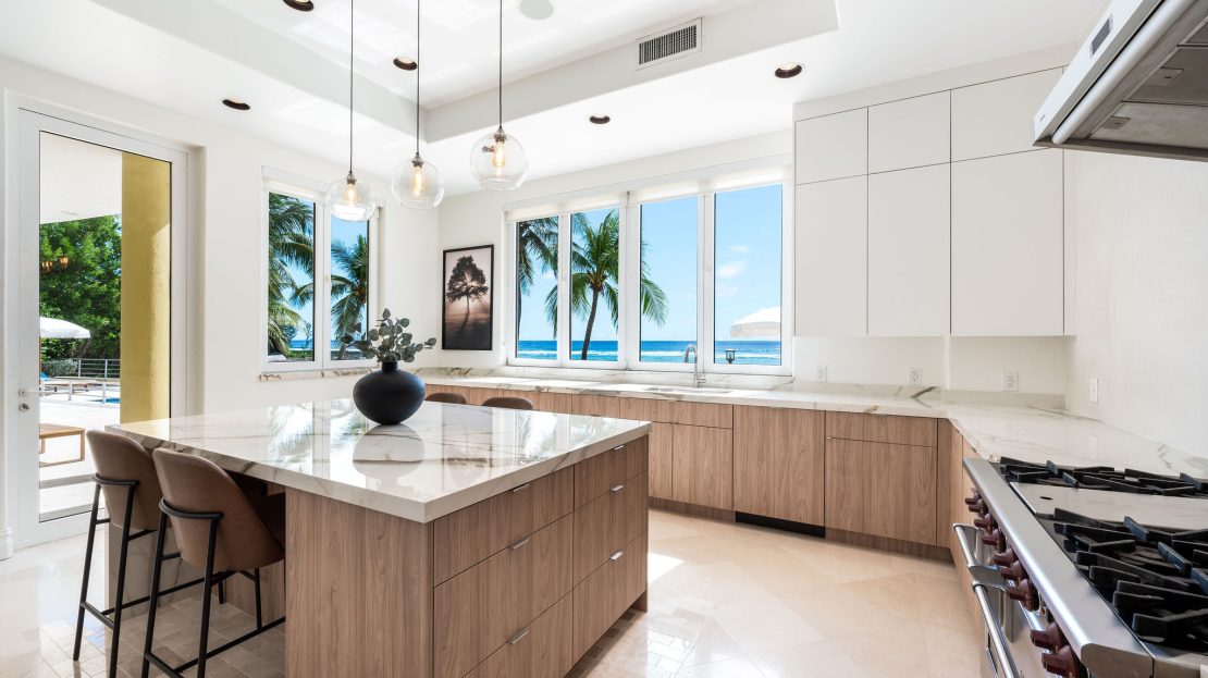 Step outside to a 50-foot resort-style pool, an expansive outdoor deck and outdoor BBQ station—ideal for alfresco dining and entertaining while enjoying the stunning ocean breeze and ethereal glowing sunrises and sunsets. The meticulously designed and completely renovated chef’s kitchen features custom two-tone white oak cabinetry, state-of-the-art Wolf, Sub-Zero, and Gaggenau appliances, exquisitely veined countertops and a center island, making it the heart of the home.