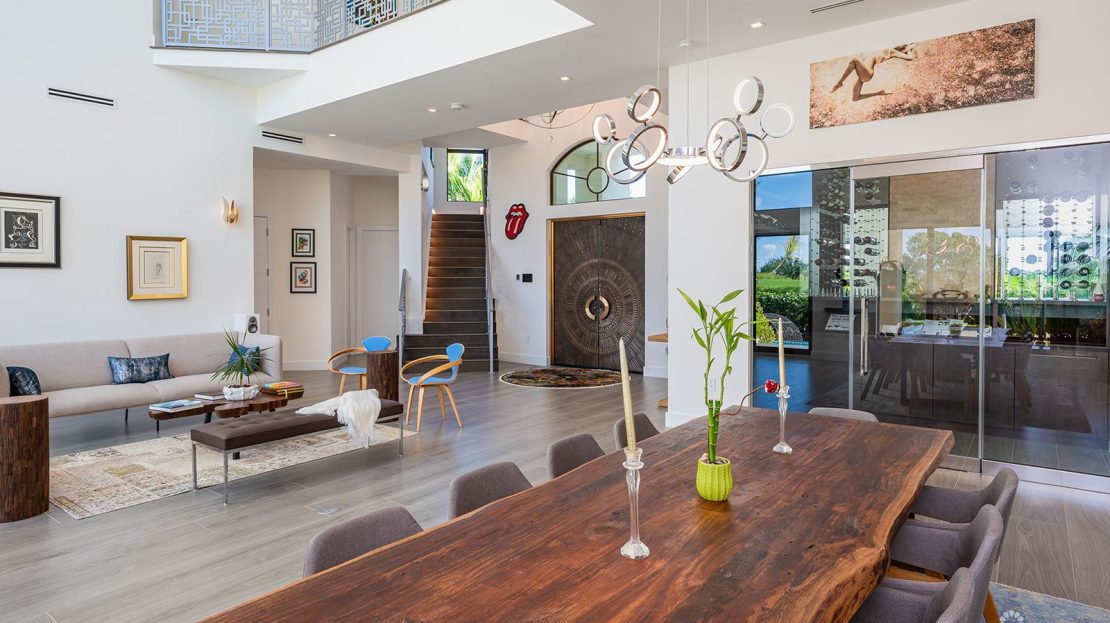 Design: Floor-to-ceiling windows with panoramic views of the golf course, canal, and gardens