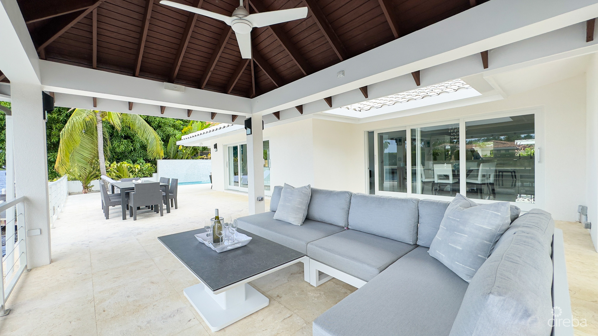 An oversized entertainment deck flows seamlessly from the interior, ideal for al fresco dining, while the private dock provides instant access to boating adventures across the North Sound and beyond.